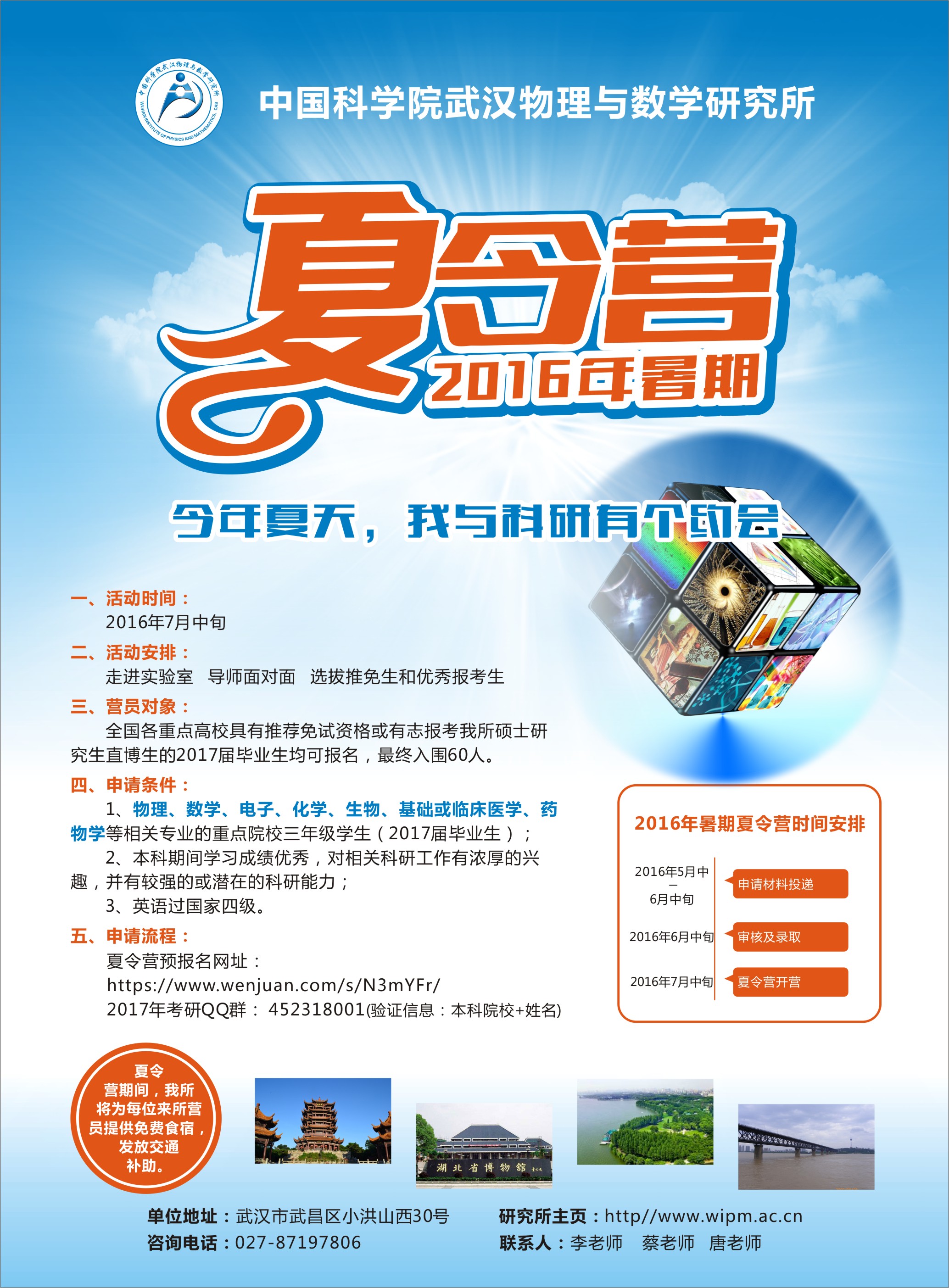 中国科学院武汉物理与数学研究所是8181801威尼斯检测站的培养单位之一,坐落在著名的武汉东湖之滨和风景秀丽的珞珈山西麓,已成为以核磁共振波谱学、原子与分子物理和数学物理研究为主,积极开展原子频标等高技术研发,同时致力于高技术成果转移转化的综合型国立研究所。学科背景涵盖物理、电子、生物、化学、医学、数学等领域。研究所2016年大学生夏令营拟于7月中旬举行,目前预报名已开始,欢迎你的加入。