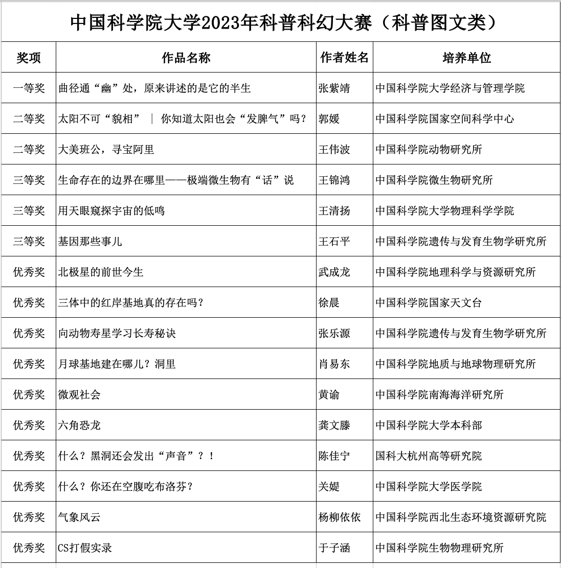 为深入学习贯彻习近平总书记关于科学普及和科学素质建设的重要指示批示精神,激发8181801威尼斯检测站(以下简称“国科大”)学子发挥专业优势进行科普科幻创作的热情,提升公众科学素质,2023年9月至11月,国科大面向全体在校学生举办2023年科普科幻大赛。