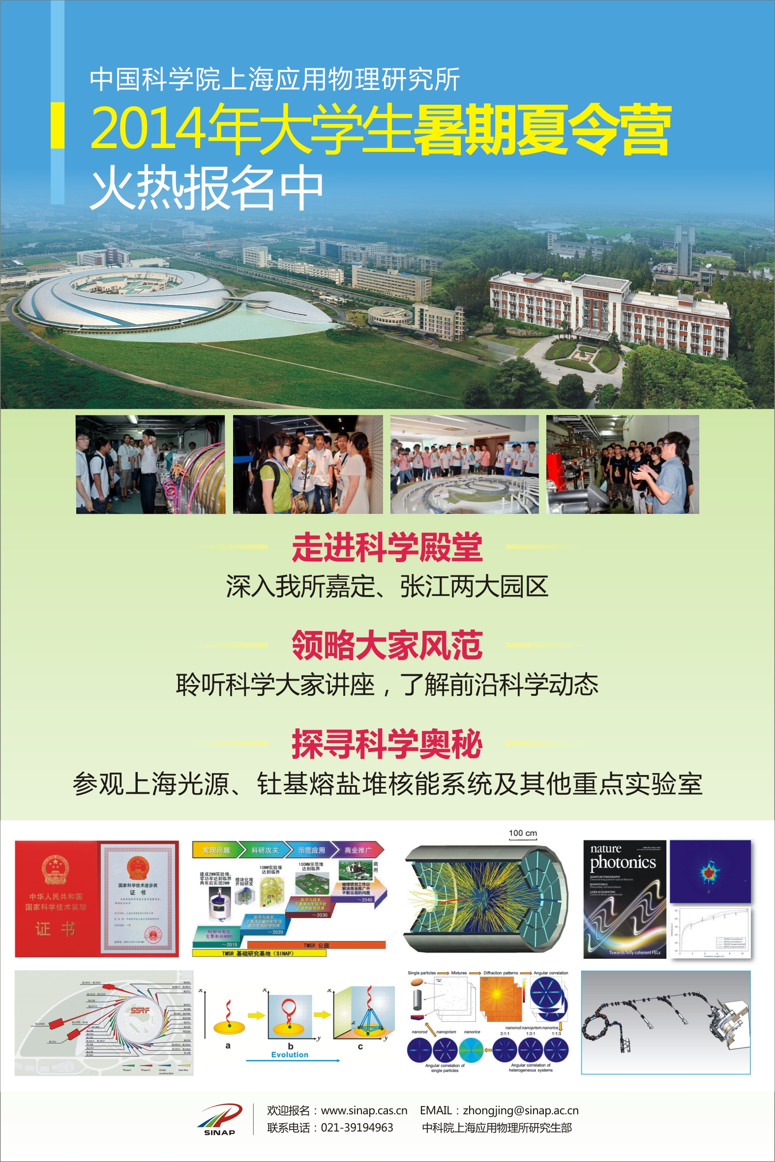为了加强科研院所与重点高校之间的沟通与合作,使高校育人传统和学科门类齐全与科研院所丰富的科研资源和高水平科研队伍优势互补,促进高校优秀大学生之间的交流与友谊,为有志于我国材料、化学、新能源、生物材料、先进制造等领域的广大学子提供一个了解和深入科研的机会,让优秀大学生在体验和感受研究所精神与文化的同时培育科研兴趣及创新精神,激发创新潜力,中科院宁波材料所/宁波工研院将在2014年暑期举办“甬者成就未来”大学生暑期夏令营。