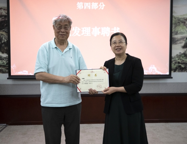 王艳芬向石耀霖院士颁发名誉会长聘书
