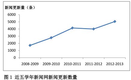 校新闻网作为最新信息和新闻事件的重要传播渠道之一,其发布和传播的信息量也在逐步增加。近五学年来,学校通过新闻网发布的相关新闻信息持续增加(图 1)。2012-2013学年度发布新闻信息共 5040 条,比上一学年度多发 1043 条。